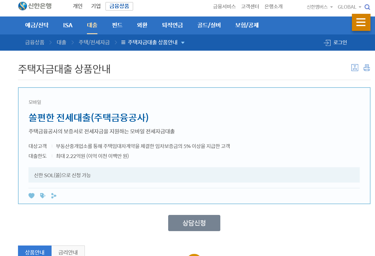 나는 저렴하기로 유명한 버팀목 전세자금 대출, 청년 우대 전세자금 대출 등 기타 사항들에는 해당이 안돼서 그냥 노멀 하게 주택금융공사가 보증하는 일반 전세자금 대출을 받아야 했다.