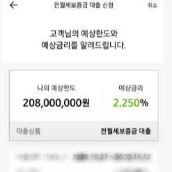 카카오 뱅크에서 더 저렴하게 견적을 받았고, 대출 심사를 진행하니 실제로 한도는 그대로, 금리는 0.001% 오른 2.251%로 대출을 받을 수 있었다.